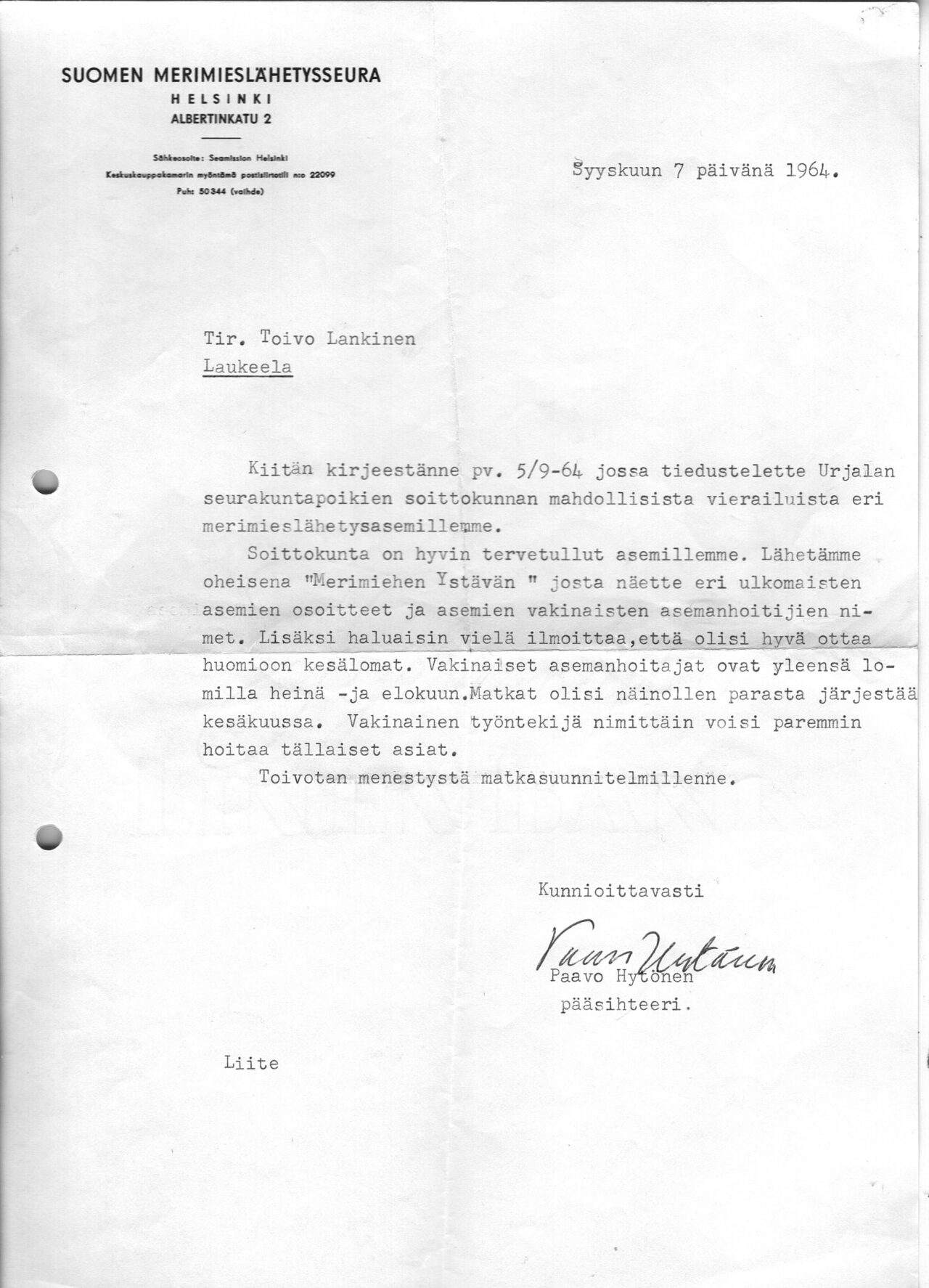 Kuorojen esiintymismatkojen suunnittelu oli erilaista ennen nettiä. Mutta nopeasti posti ja tieto kulki! Asia lähti liikkeelle Helsingistä 7.9.1964 ja käsinkirjoitettu vastaus Hampurista on päivätty jo 23.9.1964 (puhtaaksikirjoitettuna tämän tarinan lopussa). Siinä välissä viesti oli käynyt jo Urjalassakin.