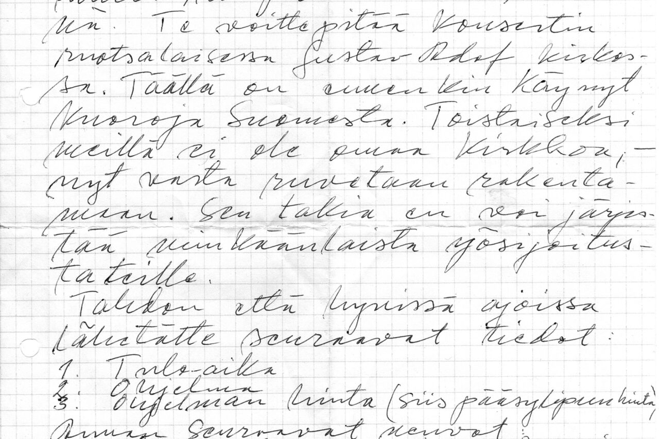 Kiitos kirjeestänne. Olette tervetulleet Hampuriin ensi keväänä. Te voitte pitää konsertin ruotsalaisessa Gustav-Adolf kirkossa. Täällä on ennenkin käynyt kuoroja Suomesta. Toistaiseksi meillä ei ole omaa kirkkoa, – nyt vasta ruvetaan rakentamaan. Sen takia en voi järjestää minkäänlaista yösijoitusta teille.